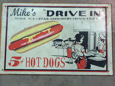 Tin Sign. Mike's "Drive In"-- 5 cent Hot Dogs!