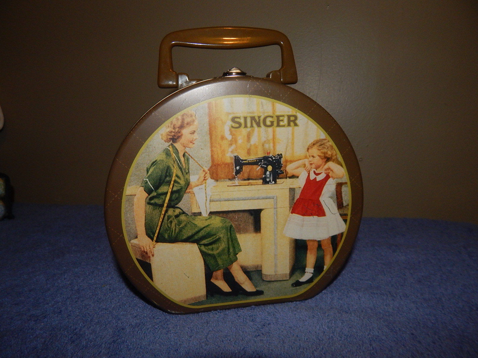 Title (ebay affiliate link): Vintage Oval SEWING KIT Tin & Handle Sewing Box with VINTAGE ADVERTISING