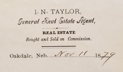 Title (ebay affiliate link): 1879 Antique Letterhead ~ I.N. Taylor, General Real Estate Agent ~ Oakdale, NE
