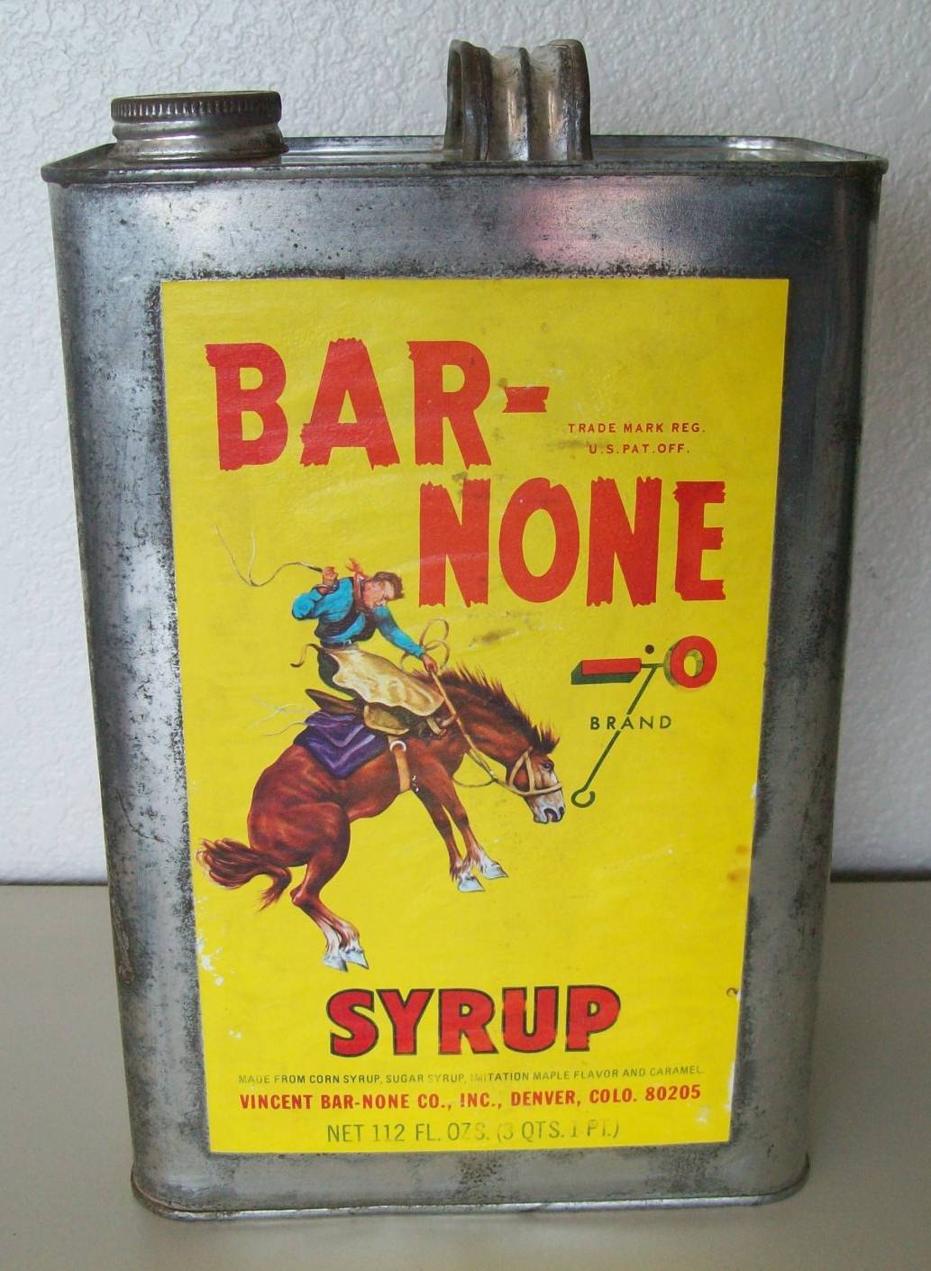 Title (ebay affiliate link): VTG LABELED DENVER COLO. VINCENT BAR-NONE CO. SYRUP TIN W/ COWBOY BUCKING BRONCO