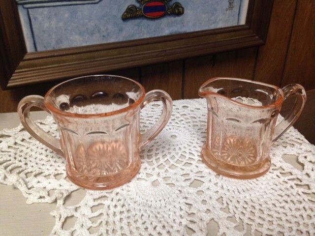 Title (ebay affiliate link): VINTAGE PINK DEPRESSION GLASS CREAMER AND SUGAR CONTAINER SMALL SIZE