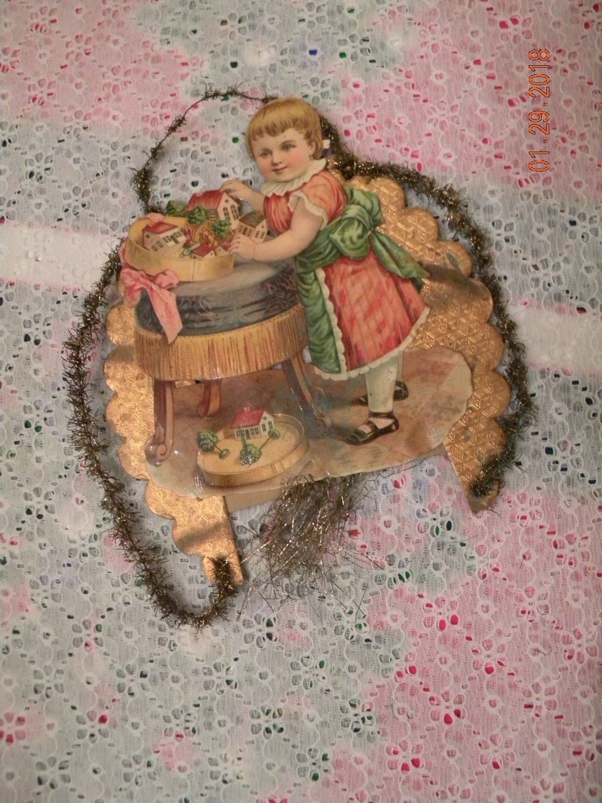 Title (ebay affiliate link): German Paper and Tinsel Ornament 1900 Sweet Child Playing with her toys