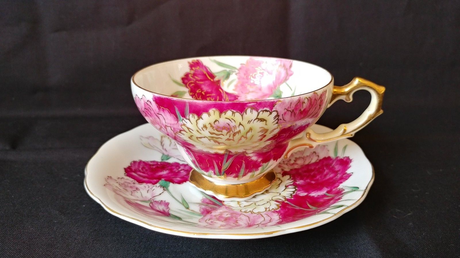 Vintage Chubu China Teacup & Saucer Carnations Gold Trim Pedestal Foot Cup