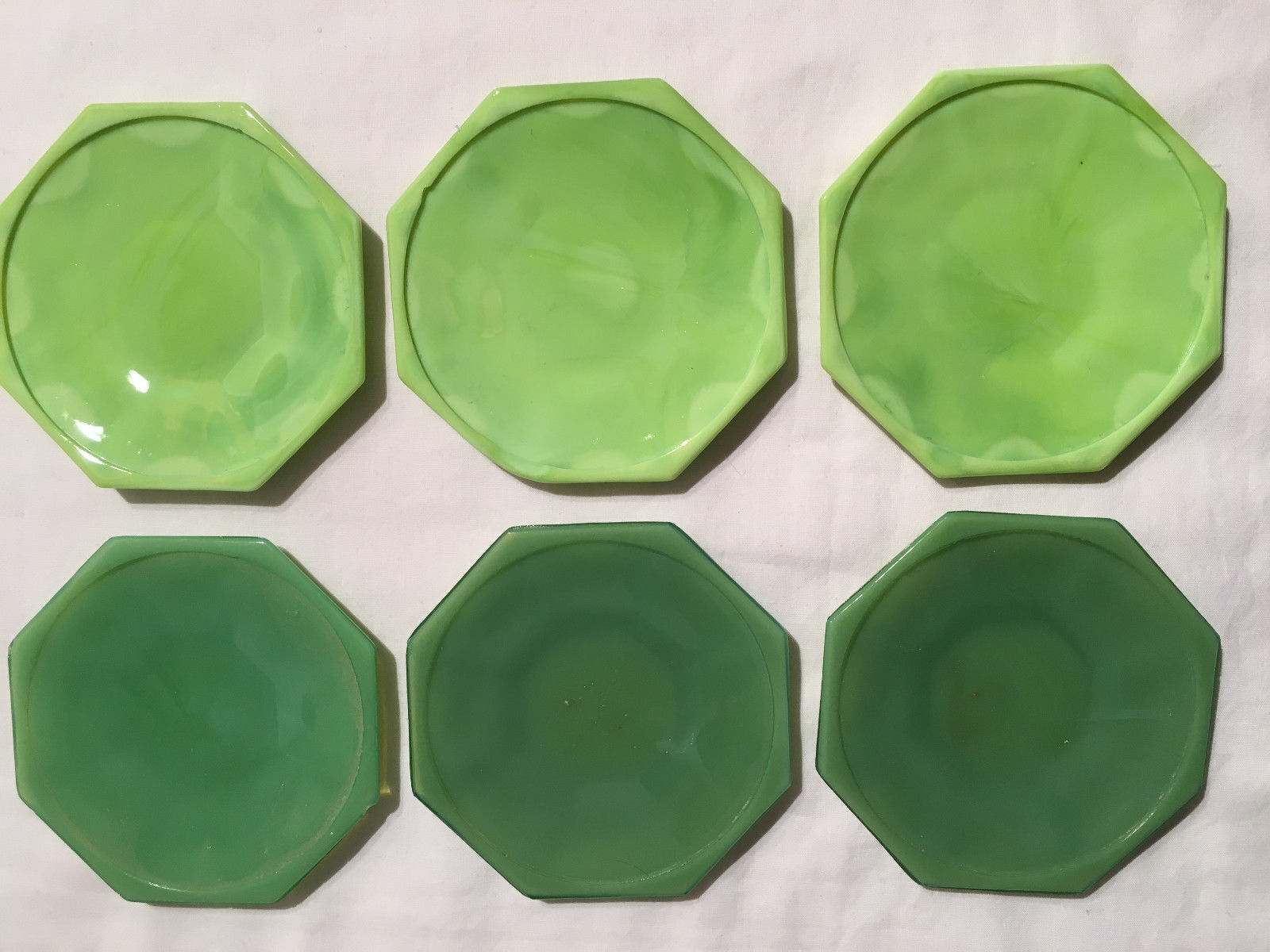6 pieces Jadeite Green Akro Agate Childs Green Glass Plate/saucer octagon NEAT