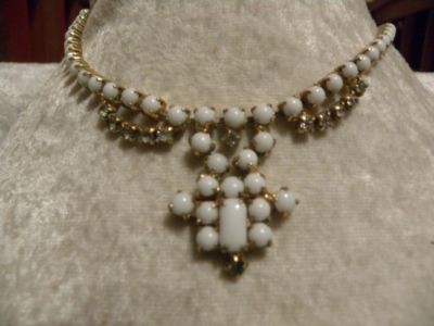 VINTAGE GOLDTONE, MILKGLASS & RHINESTONE NECKLACE