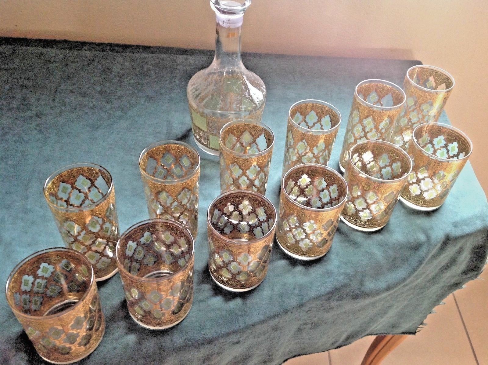 Title (ebay affiliate link): Set of Culver Valencia 22K Gold & Green Trim Highball and Tumbler PLUS Decanter