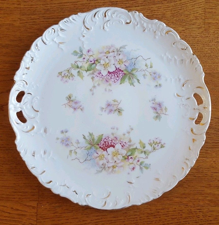 Antique Bavaria Hand Painted Embossed Handled Cake Plate, Floral