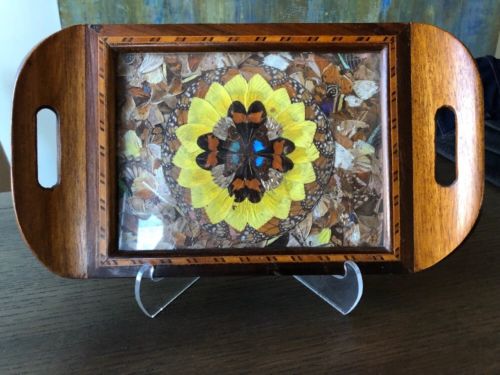 Title (ebay affiliate link): BRAZIL Inlaid Wood Serving Tray BUTTERFLY WING ART Under Glass MID-CENTURY