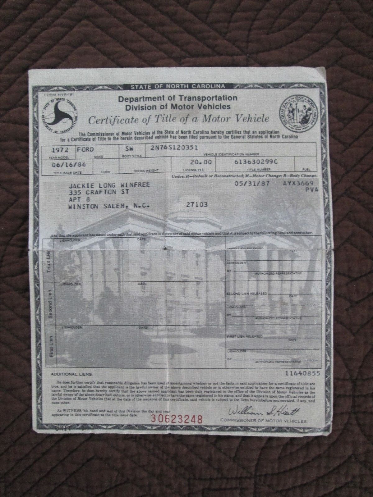 CERTIFICATE OF TITLE NORTH CAROLINA 1972 FORD STATION WAGON