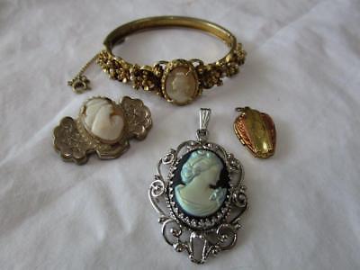 VINTAGE ANTIQUE 4 PC COLLECTION LOT CAMEO BRACELET PENDANT PIN n EMBOSSED LOCKET