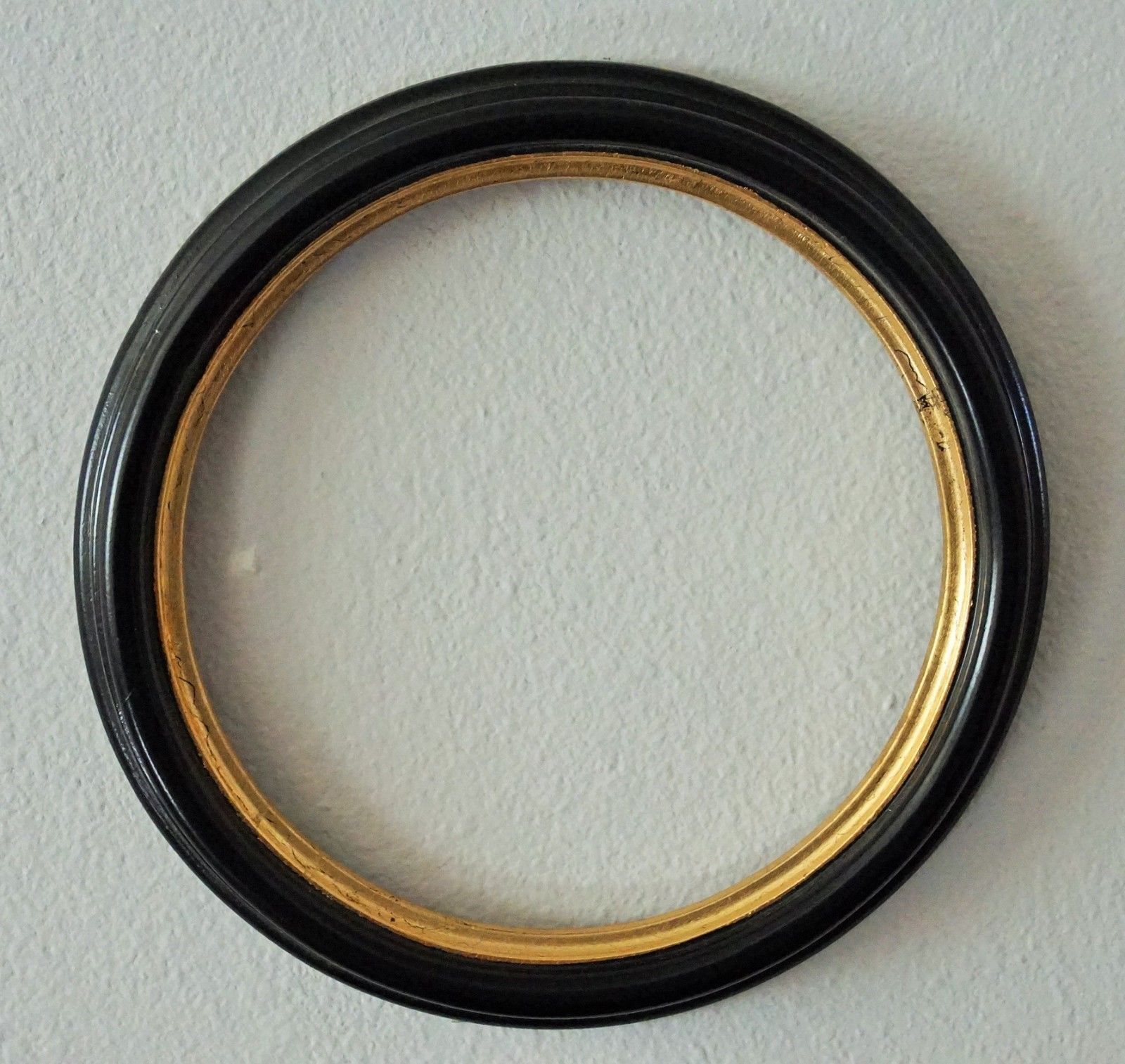 Title (ebay affiliate link): Round Picture Frame, 8", Black Finish w/ Gold Leaf Lip, Solid Wood, Italian.