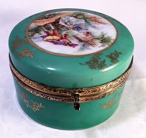 Title (ebay affiliate link): Antique German Porcelain Jewelry Powder Box Courting Scene Hinged w/ Mirror N/R