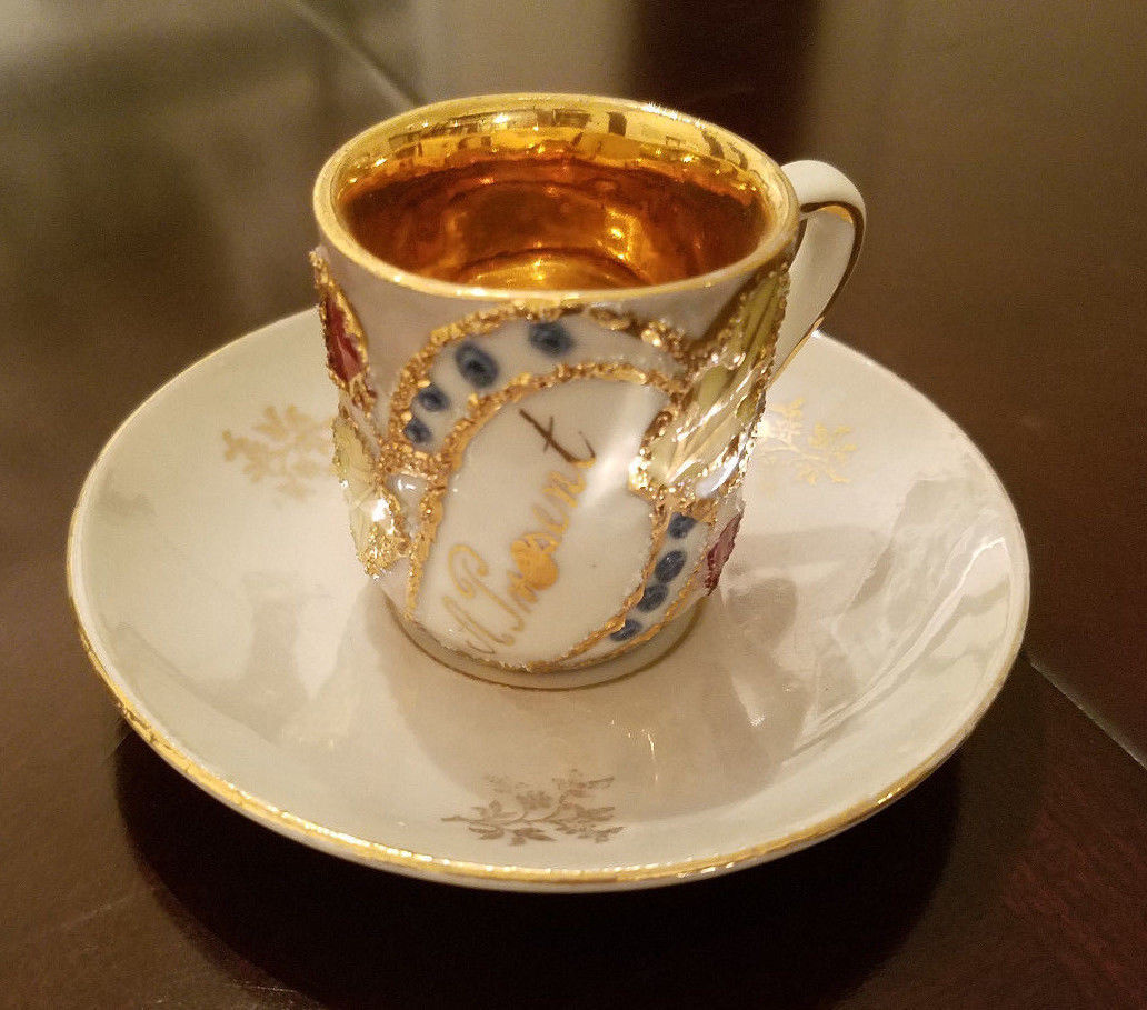 Antique German miniature floral/gold "A Present" Cup & Saucer