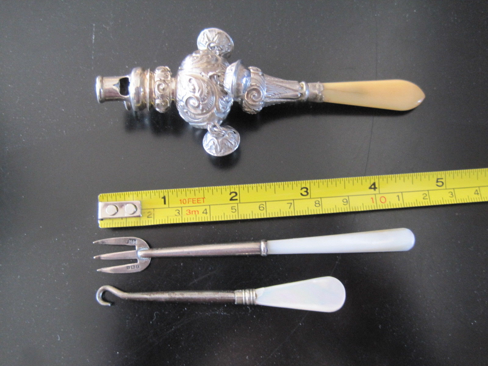 Lot Sterling Silver Victorian Antique Baby Rattle Whistle, Button Hook, Fork