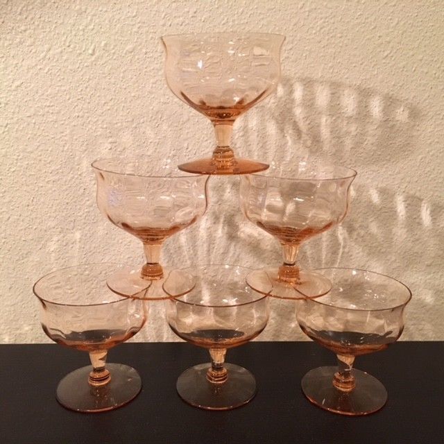 Title (ebay affiliate link): Set of 6 VINTAGE Pink Depression Glasses Footed Fruit Sherbets Dessert Champagne