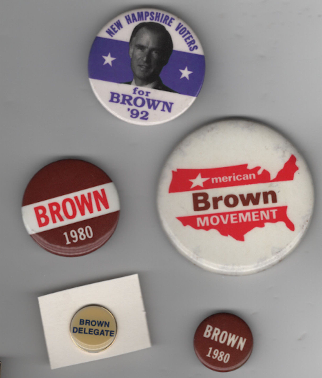 Title (ebay affiliate link): 5 Vintage Political Pins Jerry Brown Pins 5 Pin Lot Gov Calif Prez Candidate