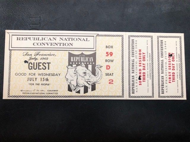 Title (ebay affiliate link): 1964 FULL TICKET OF GOLDWATER REPUBLICAN NATIONAL CONVENTION THIRD DAY