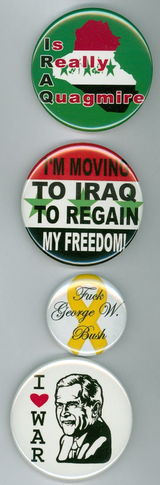 Title (ebay affiliate link): 4 Vintage 2003-04 Anti-War Iraq Bush Protest Political Pinback Buttons