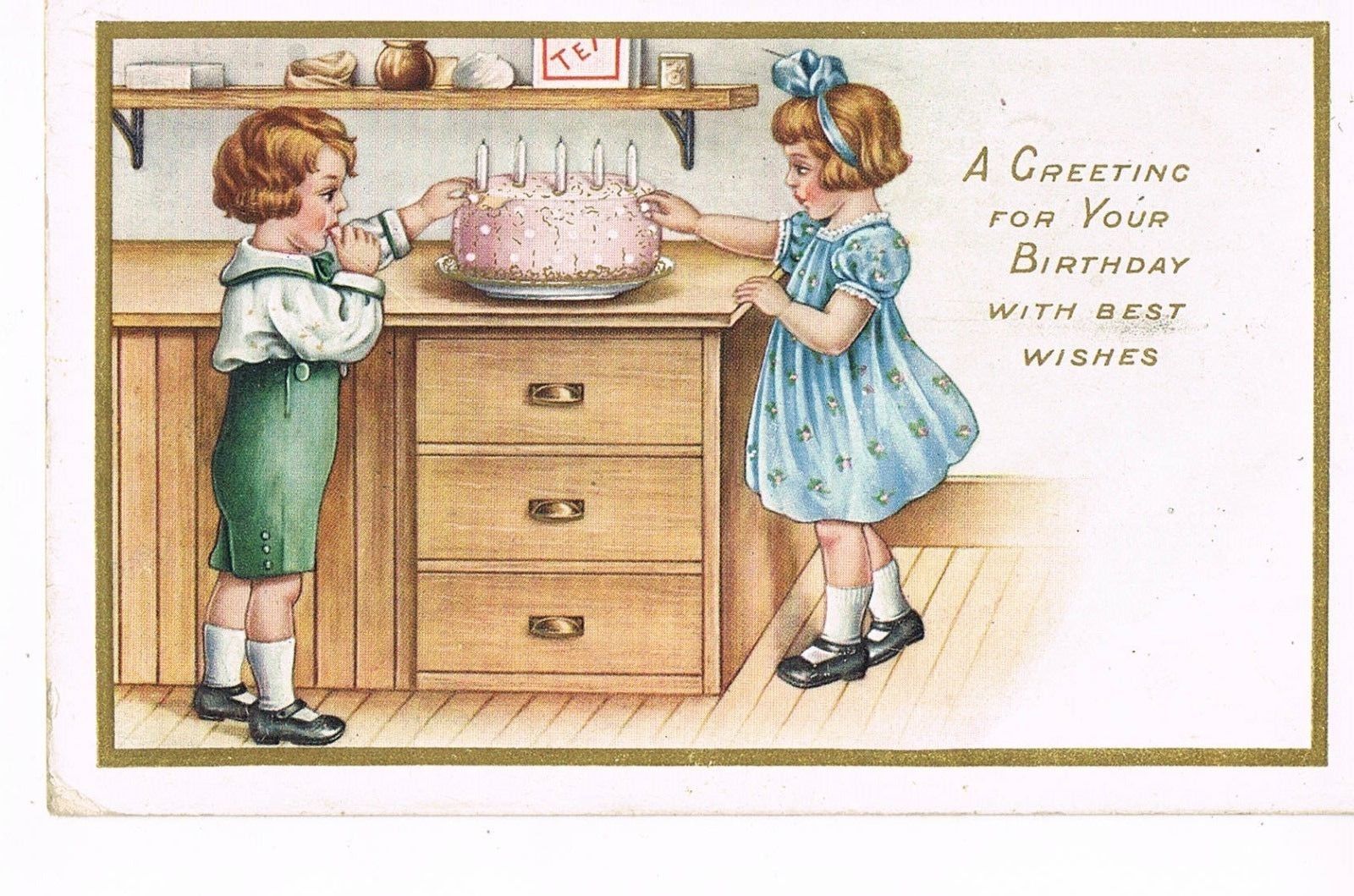 Title (ebay affiliate link): ANTIQUE BIRTHDAY Postcard (WHITNEY MADE) YOUNG BOY AND GIRL DECORATING CAKE