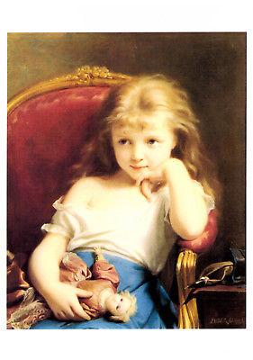 Title (ebay affiliate link): KIDS ART ~ LITTLE GIRL & DOLL Toy sits in a chair MODERN Postcard