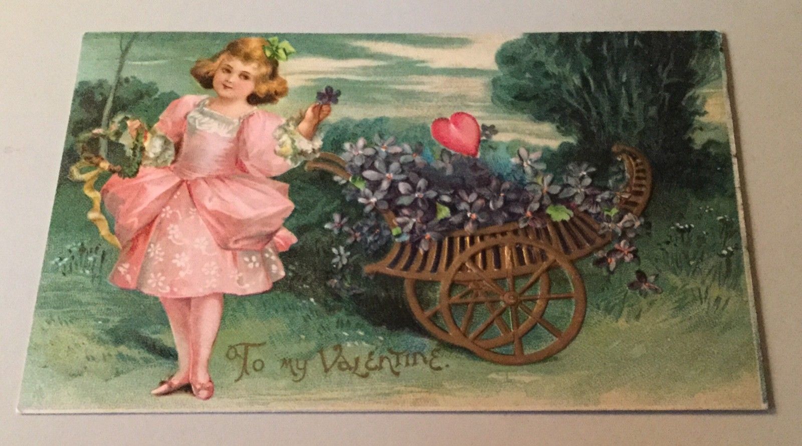 VINTAGE VALENTINE POSTCARD WITH GIRL IN PINK