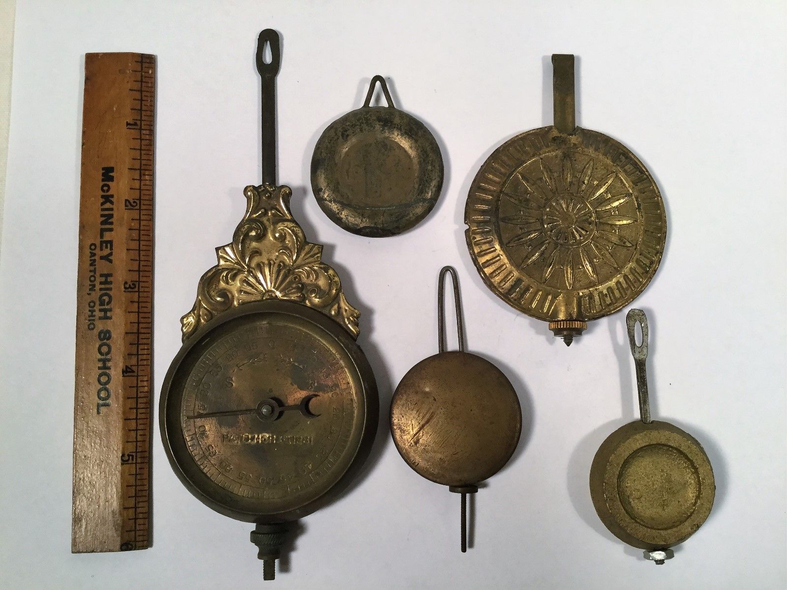 Title (ebay affiliate link): Antique Clock Ornate Pendulums Hangers Bobs Parts Steampunk lot of 6 one 1881