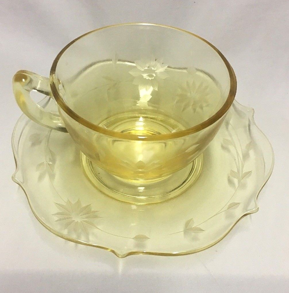Title (ebay affiliate link): Lancaster Jubilee Yellow Depression Glass Coffee Cup and Saucer Set