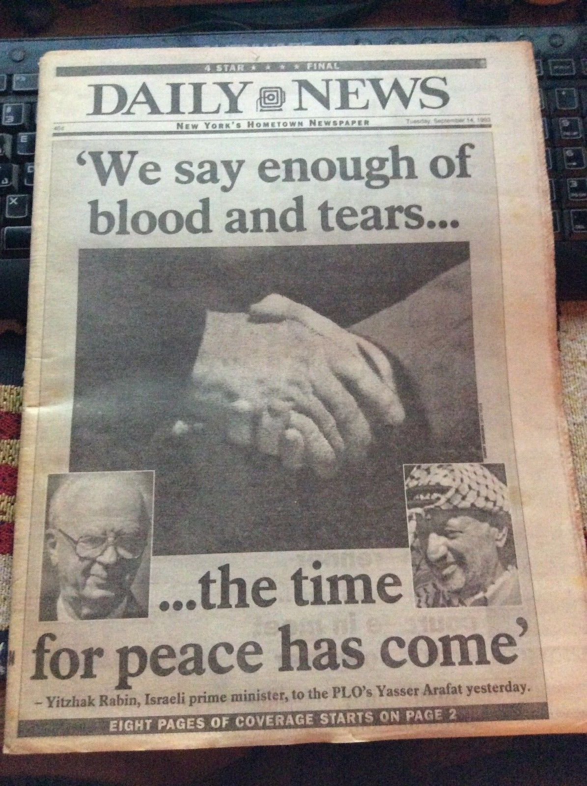 Title (ebay affiliate link): MIDDLE EAST PEACE ACCORD YASSER ARAFAT YITZHAK RABIN 1993 DAILY NEWSPAPER