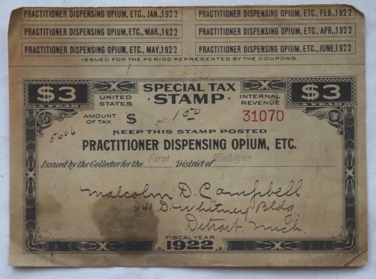 Title (ebay affiliate link): 1922 VINTAGE MICHIGAN $3 SPECIAL TAX STAMP PRACTITIONER DISPENSING OPIUM
