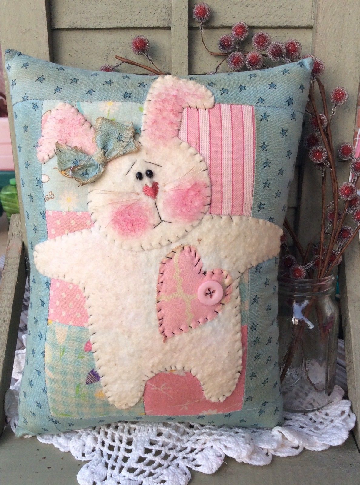 Title (ebay affiliate link): Primitive Easter/Spring Bunny Pillow*Patchwork*Light Blue*GracieLouOriginals