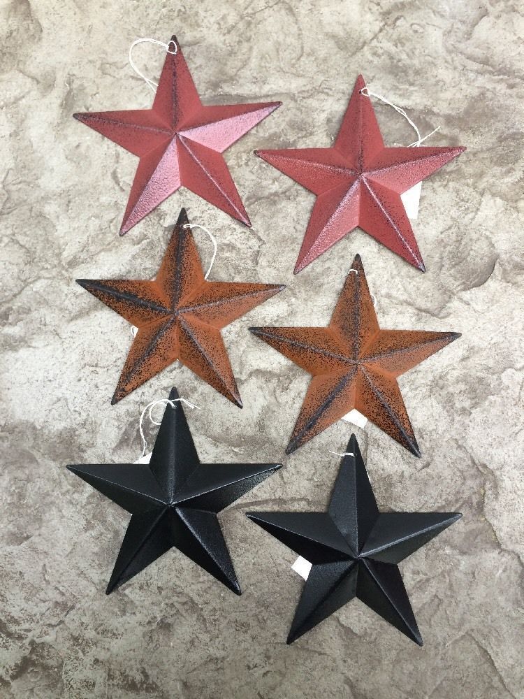 Title (ebay affiliate link): Set of 6) Assorted RUSTY/BURGUNDY/SATIN BLACK BARN STARS 5.5" PRIMITIVE COUNTRY