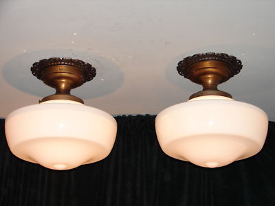 Pair Art Deco Brass/Milk Glass (School House) Fixtures