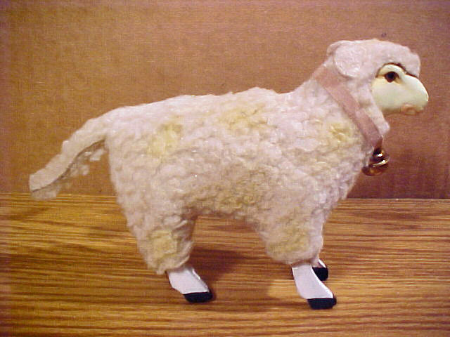 Title (ebay affiliate link): Vintage German Wooly Putz Standing Sheep Wooden Stick Legs, Ribbon, Bell & Ears