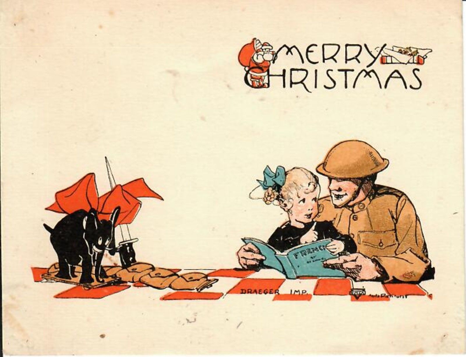 World War I Soldier with Little Girl. Elephant Toy, Toy Sword. Unusual Card