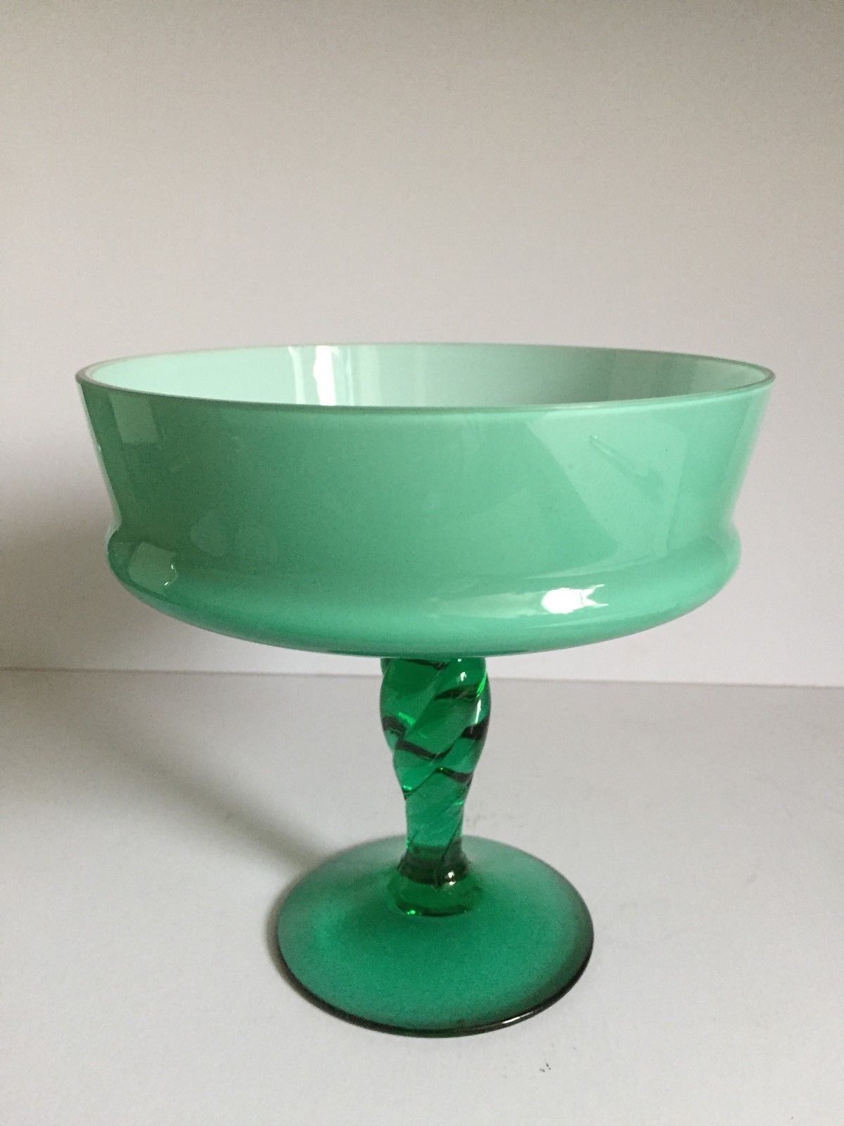 Title (ebay affiliate link): MURANO PALE GREEN MILK GLASS & CLEAR GREEN ROPE-TWIST PEDESTAL BON-BON DISH