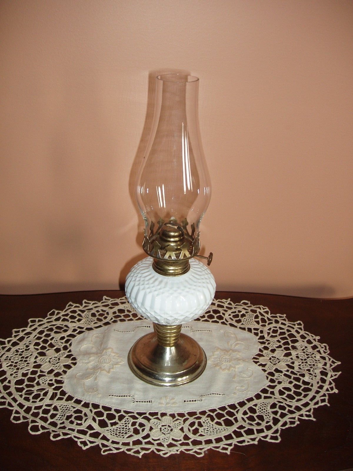Title (ebay affiliate link): Vintage or Antique MILK GLASS Oil Lamp with Clear Glass Hurricane Chimney