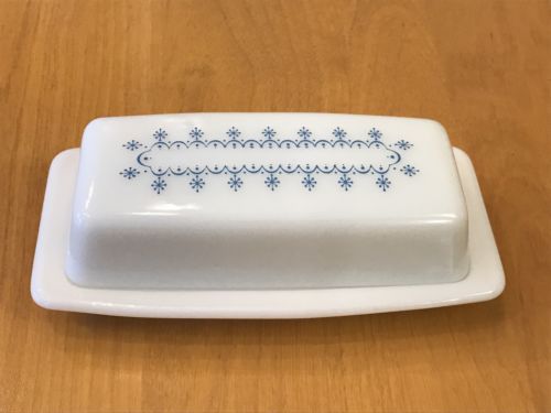 Title (ebay affiliate link): Vintage Pyrex Butter Dish Snowflake/Blue Garland Milk Glass White