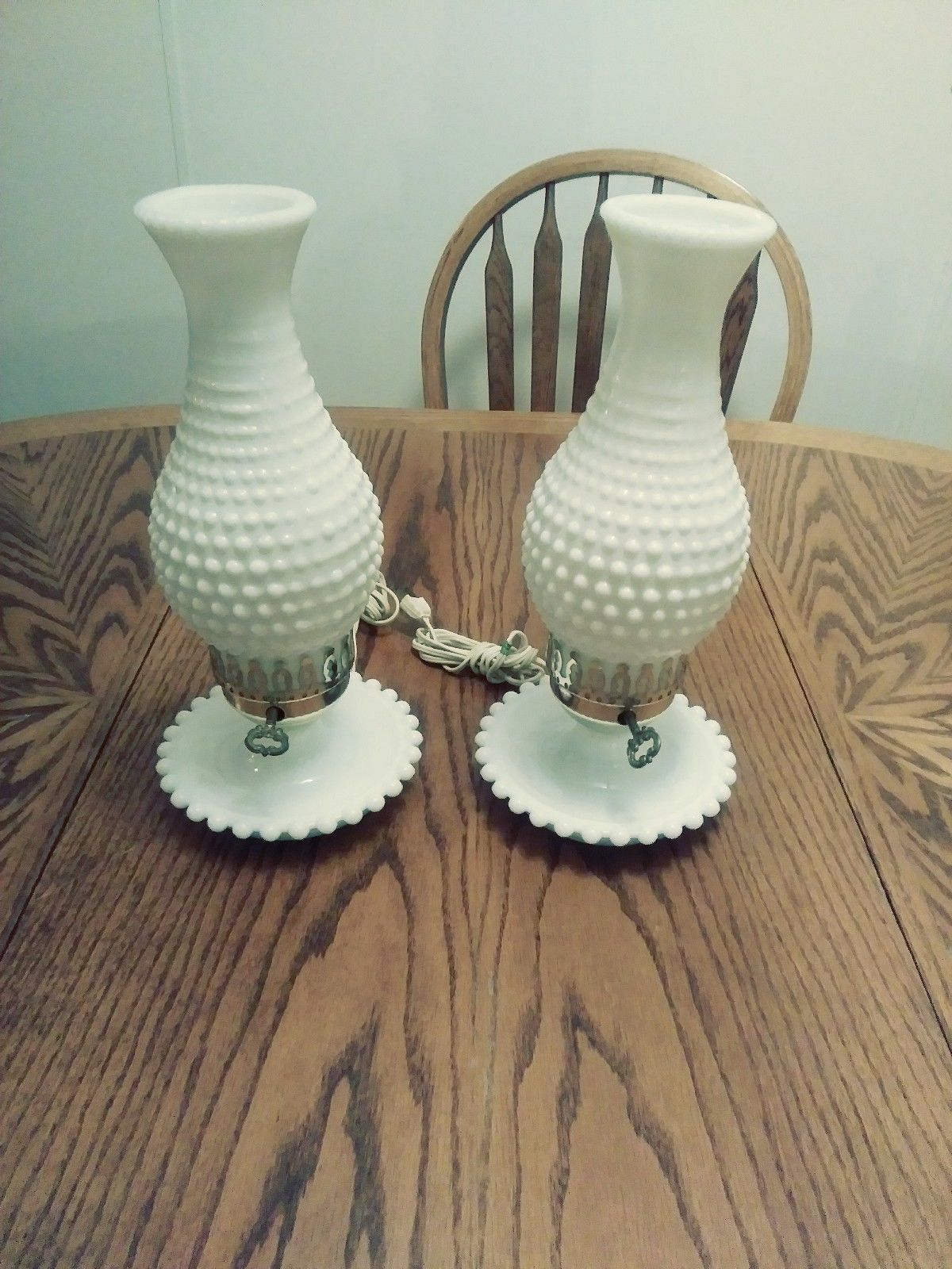 Title (ebay affiliate link): Pair of vintage white milk glass hobnail electric end table lamps