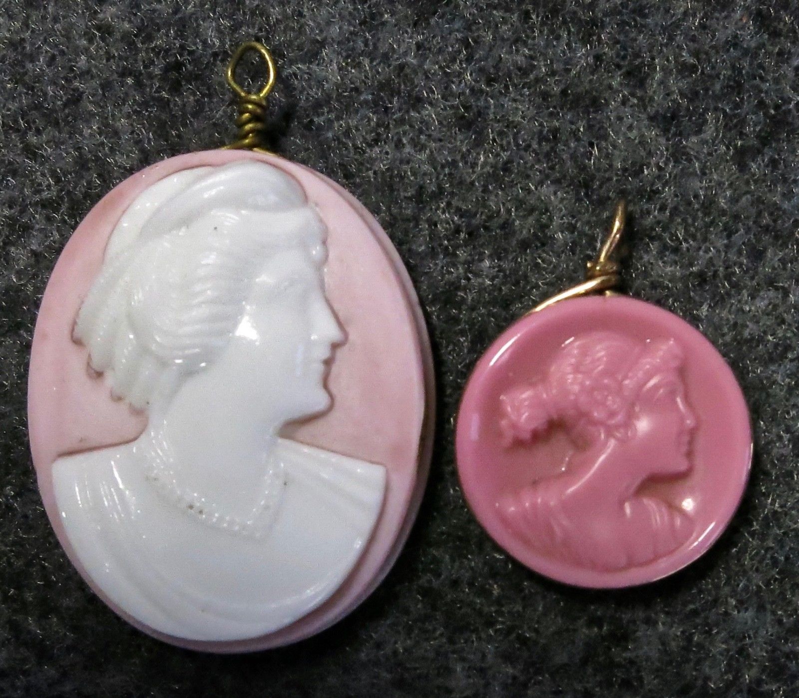 2 Old Vintage Antique Pink White Milk Glass or Stone Carved Cameo Pendants