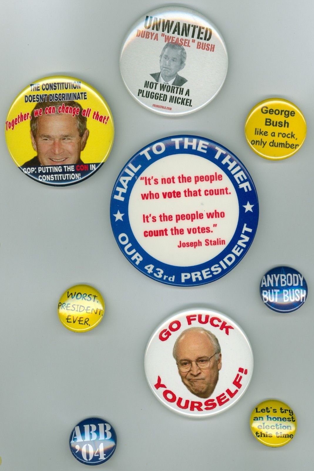 Title (ebay affiliate link): 9 Vintage 2003-04 Anti-War Peace Protest Political Cause Pinback Buttons Unwantd