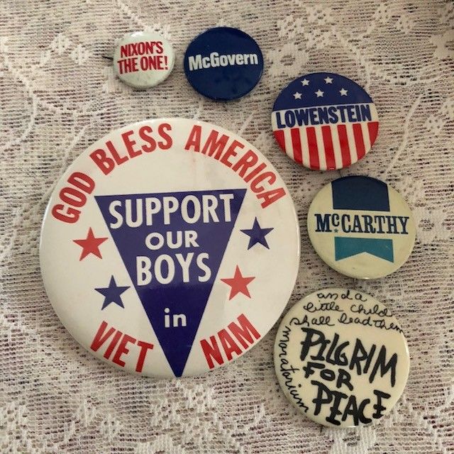 Title (ebay affiliate link): 6 Vtg.1960s-70s Peace/Vietnam War/ Support Our Troops /Nixon /Pinback Buttons