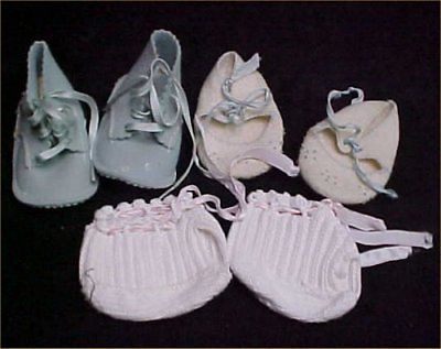 Title (ebay affiliate link): 3 Pair Vintage Antique Baby Doll Booties Dainty Hand Crocheted Felt Blue 1940s