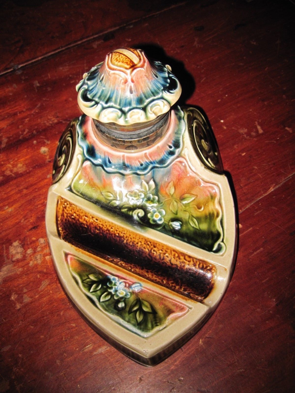 c.1880 Majolica Inkwell with covered top and place to lay the pen- Marked #3182