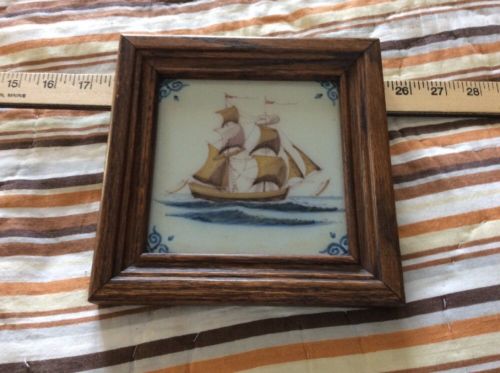 antique framed blue and Tan Ship tiles hand painted Netherlands