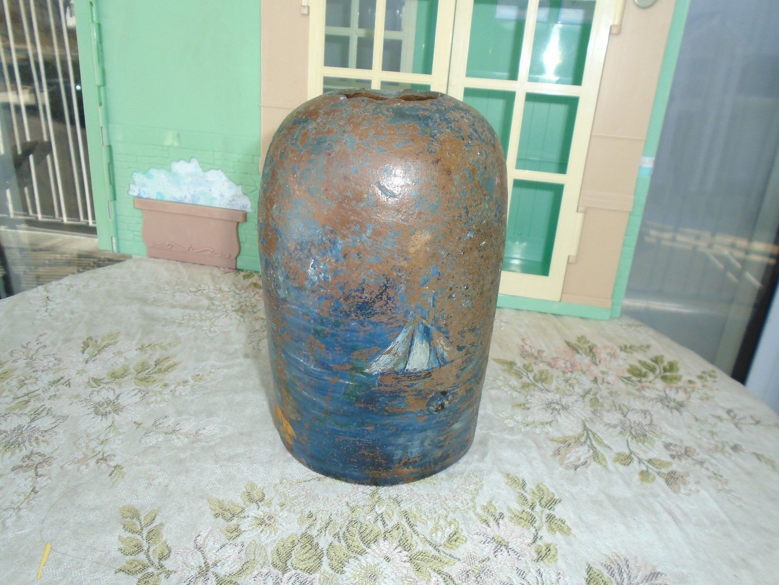 Small Antique Crock Stoneware Has faded scenes Sailboat etc