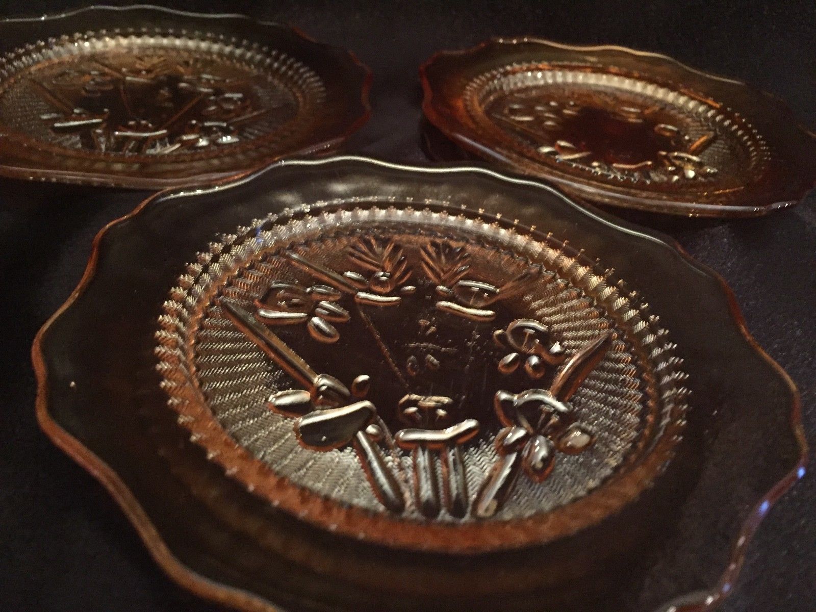 Title (ebay affiliate link): Jeanette Iris & Herringbone Amber Depression Glass 5 1/2" Bread Plates -set of 3