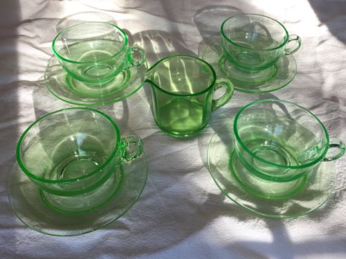 Title (ebay affiliate link): Set Of 4 Vaseline Green Depression Glass Tea Cups With Saucers & Green Pitcher