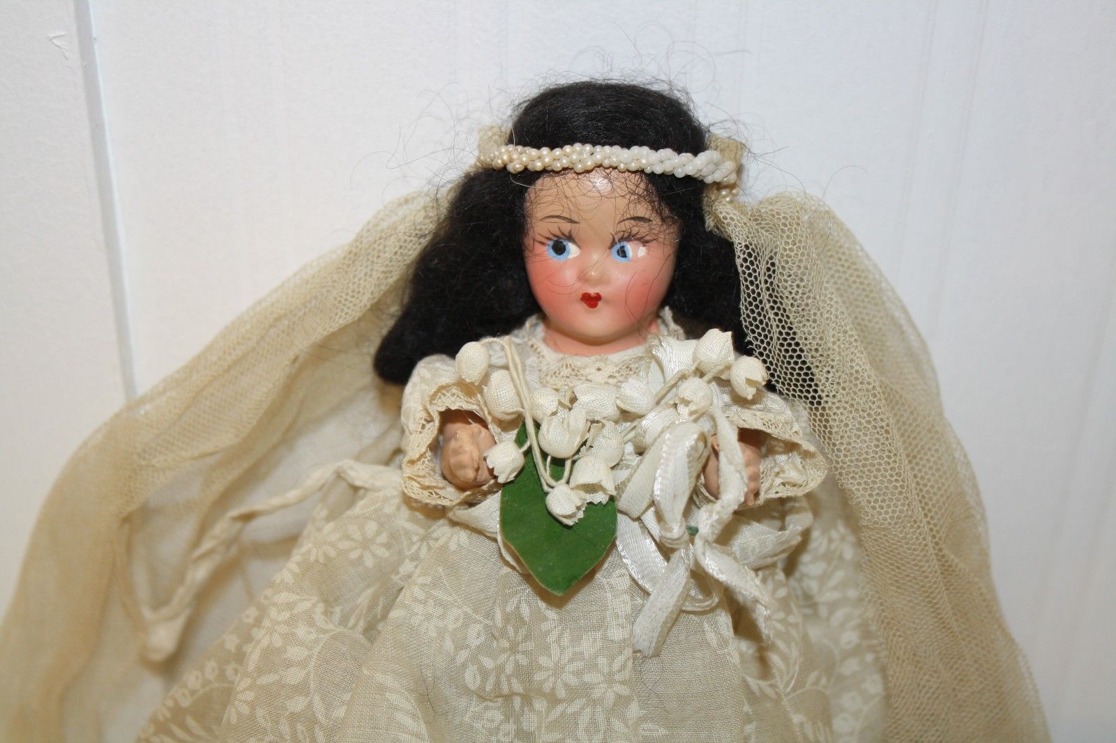 Title (ebay affiliate link): Vintage Composite Wedding doll 7.5" movable arms mohair hair Antique