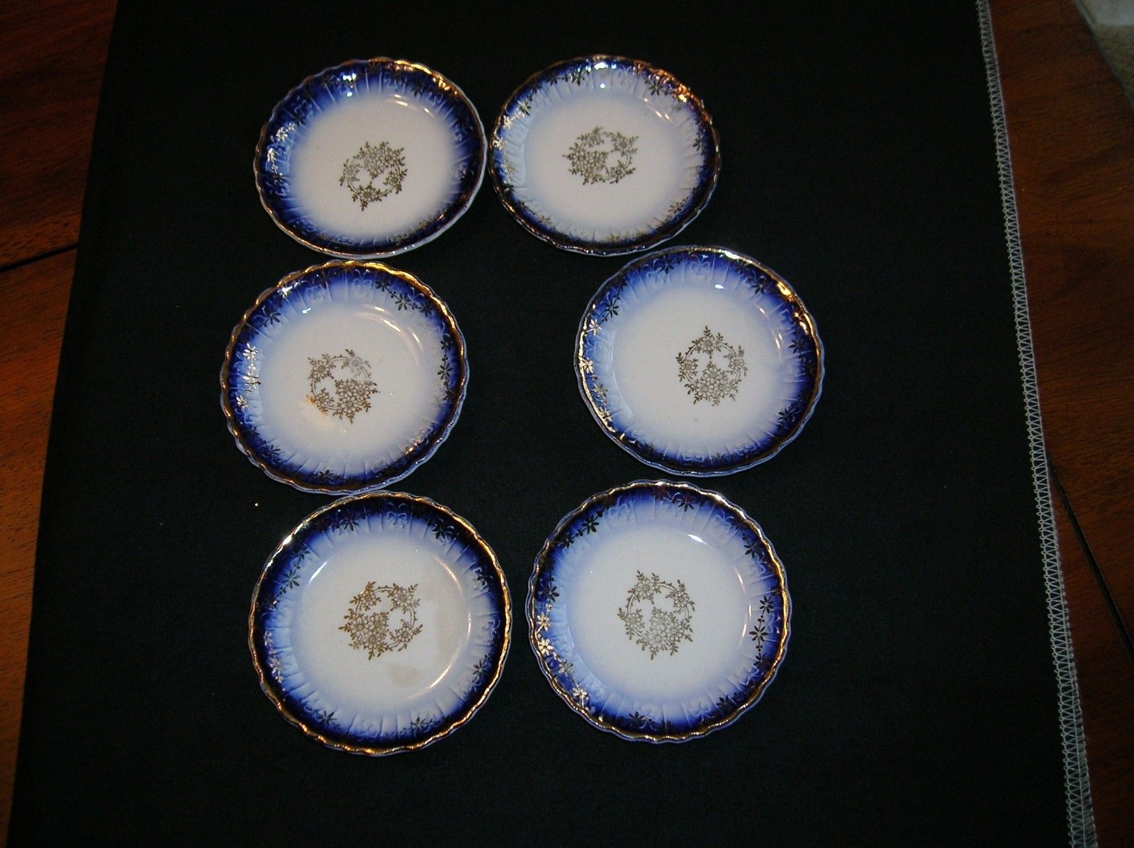 6 ANTIQUE FLOW BLUE PORCELAIN BUTTER PATS COBALT ON WHITE GOLD TRIM FLOWER 3"