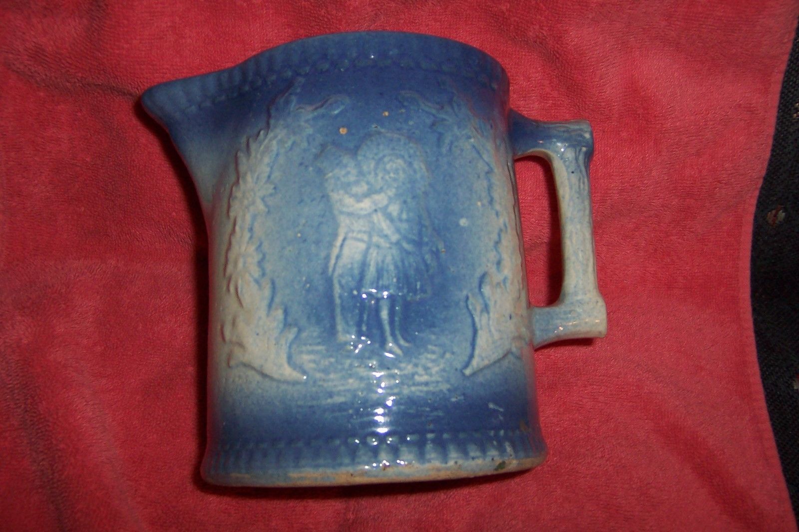 STONEWARE PITCHER, BLUE AND WHITE, CAPT. JOHN SMITH AND POCAHONTAS